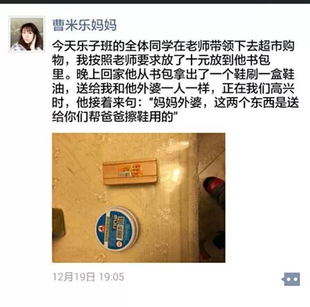 今天乐子班的全体同学在老师带领下去超市购物,我按照老师要求放了十元放到他书包里。晚上回家他从书包拿出了一个鞋刷一盒鞋油,送给我和他外婆一人一样,正在我们高兴时,他接着来句:“妈妈外婆,这两个东西是送给你们帮爸爸擦鞋用的”